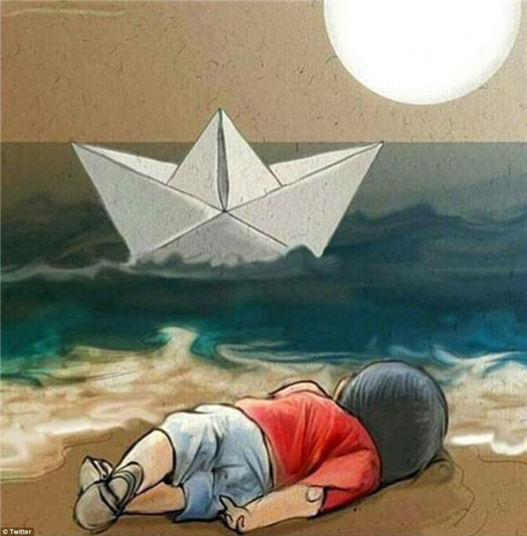 事情發(fā)生后,人們紛紛在網(wǎng)上以漫畫哀悼小Aylan。有像"上帝會(huì)在你左右的,小天使"這樣的傷感,也有對(duì)難民危機(jī)的反思和對(duì)戰(zhàn)爭(zhēng)的批判。
