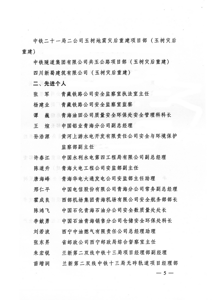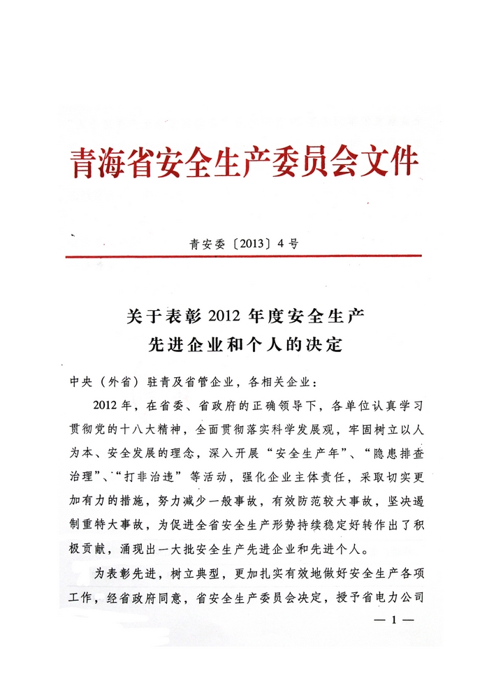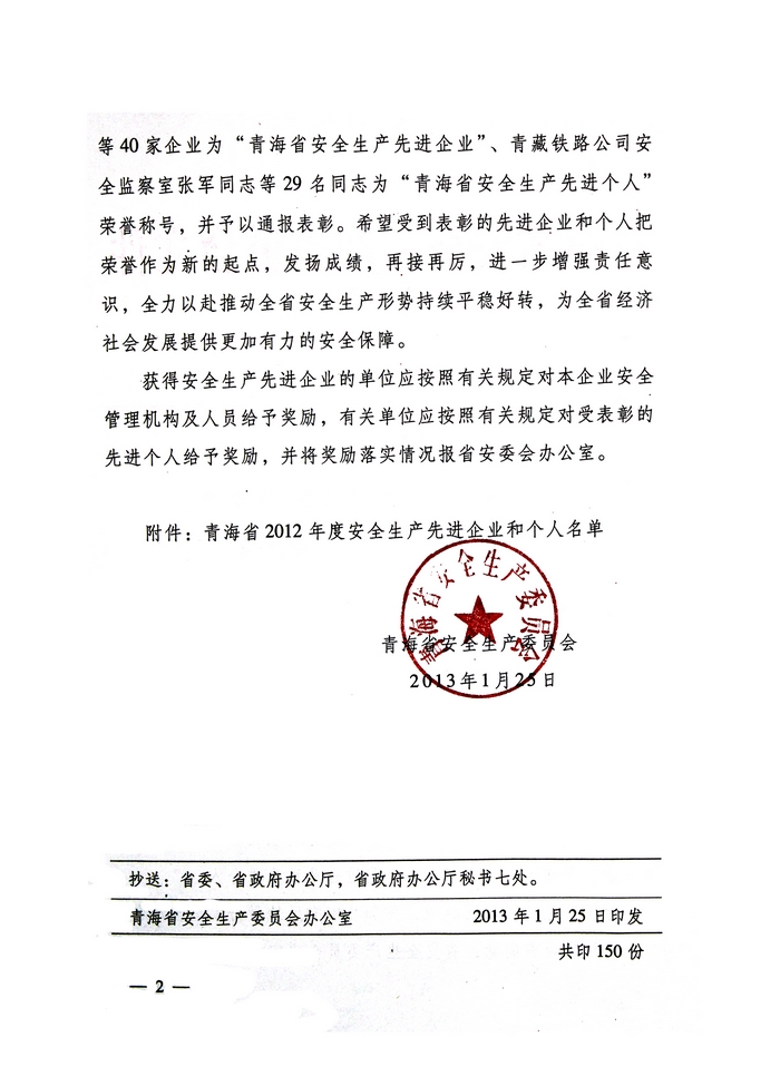 2012年,在省委、省政府的正確領(lǐng)導(dǎo)下,青海省物產(chǎn)集團(tuán)總公司認(rèn)真學(xué)習(xí)貫徹黨的十八大精神,全面貫徹落實科學(xué)發(fā)展觀,牢固樹立以人為本、安全發(fā)展的理念,深入開展"安全生產(chǎn)年"、"隱患排查治理"、"打非治違"等活動,為促進(jìn)全省安全生產(chǎn)形勢持續(xù)穩(wěn)定好轉(zhuǎn)做出了積極貢獻(xiàn)。為此,經(jīng)省政府同意,省安全生產(chǎn)委員會決定授予青海省物產(chǎn)集團(tuán)總公司"2012年度安全生產(chǎn)先進(jìn)企業(yè)"榮譽稱號。